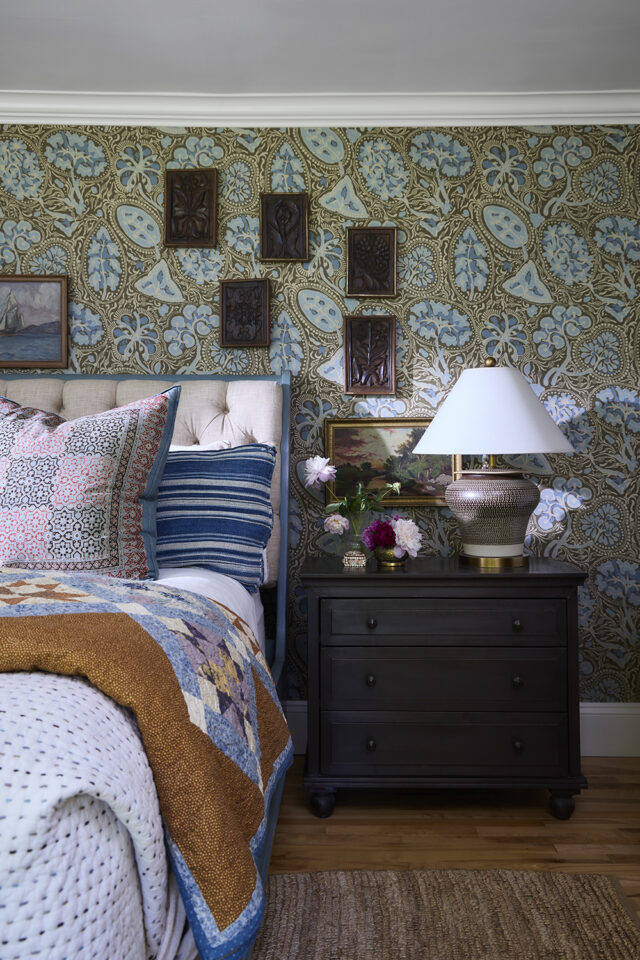 “My bedroom always felt cozy and personal but adding the wallpaper last year really brought it all together. The print makes me think of seed pods and again, it takes me back to the idea of block-printing and batik that resonates deeply with me. I made the bedframe back when I was designing furniture and had the Henhouse store. Another passion of mine on the layering theme, is making a bed. To me, it’s not just about a fitted sheet and a duvet! It’s another excuse to use beautiful textiles like my vintage quilt and an indigo-dyed blanked I had made into a lumbar pillow. The wooden pieces on the wall are a recent addition from Conifer Shop in Lunenberg; they’re actual block-printing pieces with floral themes so of course I had to have them.”