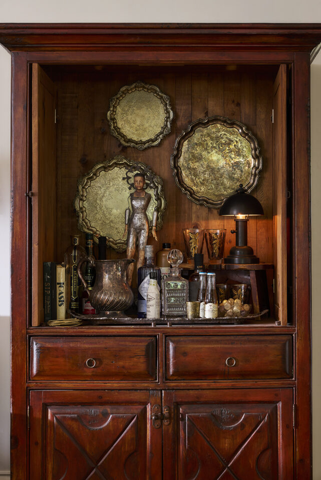 “This is an old TV cabinet from back in the days when we all had those deep TVs, and it’s a piece I had from when I was faux-finishing furniture. The silver trays belonged to my grandmother, and I was looking for a creative way to use them. My kids think the saint figurine, which I picked up in Mexico, is creepy but I love this kind of vintage, day-of-the-dead iconography. Now she’s the patron saint of my bar!”