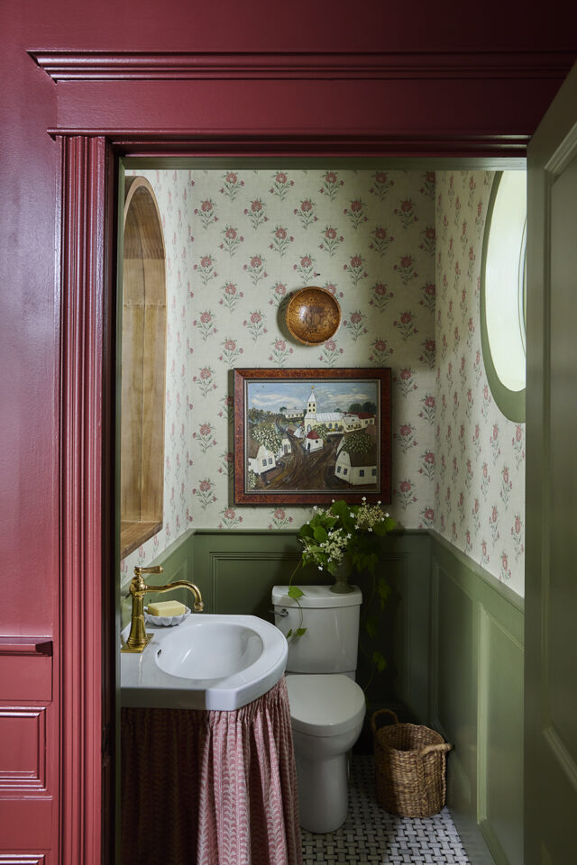 “Bathrooms can be cold and stark, so that’s why layering feels especially important. In my powder room, I disguised an ugly vanity with a fabric skirt, added new wallpaper, and painted out all the trim in Bancha by Farrow & Ball. My daughter, Lila, had the travel bug and wanted some extra money so I paid her to do it — the apple doesn’t fall far from the tree! The painting was a gift from the owner of an antique shop I worked in when I lived in Vancouver and the hand-tooled folk art bowl above it was a local find. The carving says, ‘As the sun colours flowers, so art colours life,’ and that pretty much sums up my design philosophy right there.”