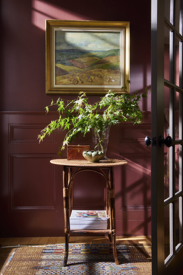 “My back entry needed a refresh so I decided to saturate it in Preference Red by Farrow & Ball. Whether it’s red, blue, or green, I’m drawn to colours with earth undertones, and that’s definitely a recurring theme in our work. I also like colours that change — this one can shift from pink to oxblood and brown throughout the day. The crisp greens and blues of the vintage painting really pop against the walls now.”